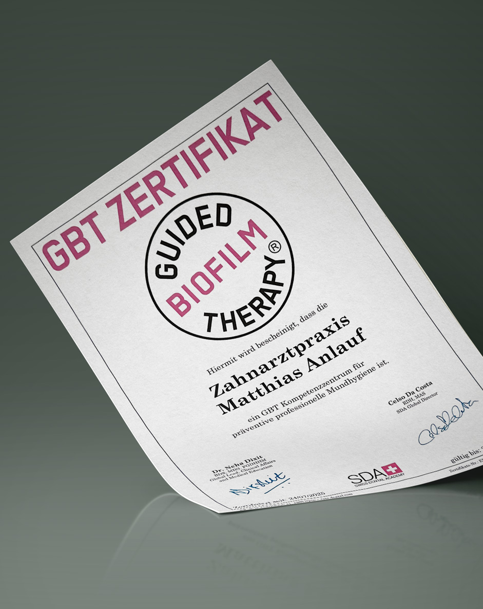 In unserer Praxis setzen wir die Guided Biofilm Therapy (GBT) ein. Dieses wissenschaftlich fundierte Konzept entfernt bakteriellen Biofilm, den Hauptverursacher von Karies und Parodontitis, besonders schonend und effektiv.